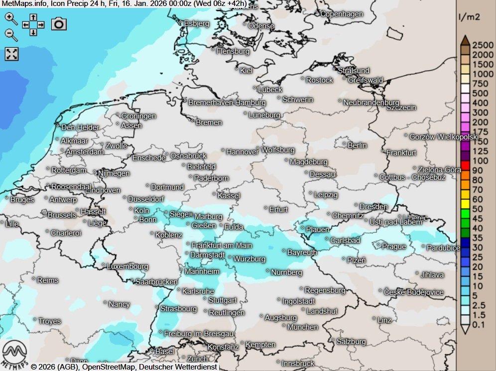 Die Lufttemperaturen und Wetterkarte für Donnerstagfrüh (06:00 Uhr) sowie die 24-Stunden-Regenmengen für Donnerstag nach ICON: