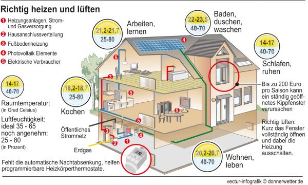 Durch eine Abkühlung auf 16-18 Grad über Nacht im Wohnzimmer können leicht 20-30 Prozent Energie gespart werden. Wenn die Heizungsanlage keine automatische Nachtabsenkung durchführt, helfen programmierbare Thermostate, die auf das Ventil des Heizkörpers geschraubt werden. Doch Vorsicht: Wer zum Beispiel das Wohnzimmer über Nacht und am Arbeitstag auskühlen lässt, um es dann abends für ein paar Stunden aufzuheizen, wird trotz hoher Lufttemperaturen das Frösteln bekommen: Zum Temperaturempfinden trägt auch die Strahlungswärme der Wände bei. Lassen Sie die Wände nicht auskühlen!