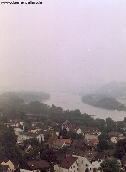 Eine Nimbostratus- oder Stratuswolke hängt über dem Rheintal. Die Sicht wird sehr schlecht. Vielleicht handelt es sich hierbei um eine Warmfront, die durch das Tal zieht. Eine Prognose ist fast unmöglich, da wir das Wetter den Tag über beobachten müssten, um eine Vorhersage zu machen was uns noch erwartet.