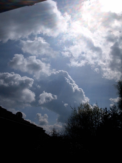 Zu sehen ist eine Cumuluswolke, die rasch in die Höhe wächst. Sie hat das Stadium mediocris erreicht. Sie ist schon ca. 6 km hoch. Andere kleinere Cumuluswolken haben sich um diese Wolke herum gebildet.