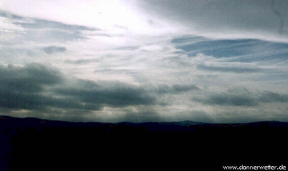 Zwei Wolkentypen in verschiedenen Höhen scheinen herein zu ziehen. Hohe Wolken der Cirrus spicatus und eine Cirrustratuswolken-Familie liegen viel höher als die Stratucumuluswolken in der unteren Troposphäre. Für mich sieht es hier nach einem Tiefdruckgebiet aus. Ich denke, dass ein Tief auf den Beobachter zieht, welches in der Nacht Regen bringen wird.