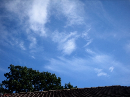 Das Bild zeigt sich auflösende Altocumuluswolken. Am oberen Rand sind Cirruswolken erkennbar. Diese befinden sich in einer Höhe von 6-7 km, die Altocumulus in einer Höhe von 3-4 km. Die Cirruswolken scheinen der Unterform spissatus zuzugehören.