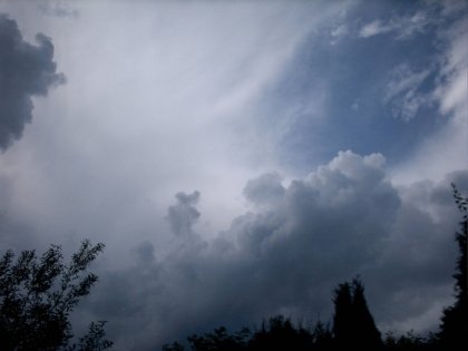 Beschreibung: Zu sehen ist eine Stratocumuluswolke sowie Cirruswolken und direkt in der Bildmitte eine Cumulonimbuswolke.