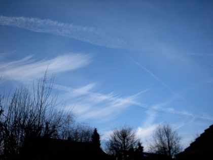 Beschreibung: Das Bild zeigt Cirrus-fibratus-Wolken sowie Kondensstreifen, die immer mehr auseinander wehen und sich dann auflösen.
