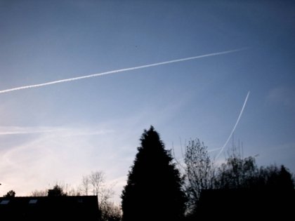 Das Bild zeigt mehrere Kondensstreifen in einer Höhe von rund 10 km. Wenn sich die Kondensstreifen auflösen, ist dies ein gutes Wetterzeichen.