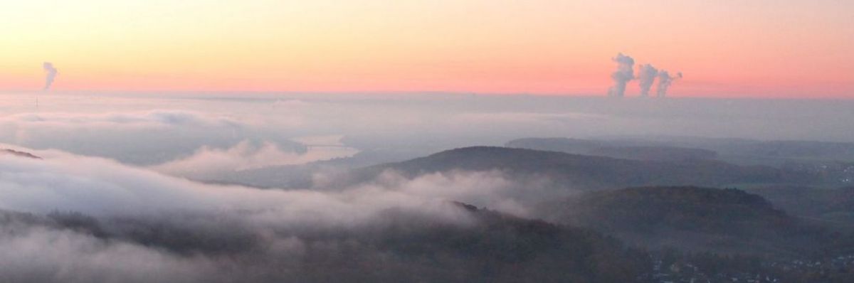 Das Bild zeigt eine typische Szene bei Inversionswetterlage und Dunkelflaute: Aus dem sonnigen Siebengebirge heraus öffnet sich der Blick auf Wasserdampfschwaden, die sich über dem dichten Nebel im Rheinland abzeichnen. Romantisch wirkt das allemal – trotz der ernsten Energiefrage dahinter.