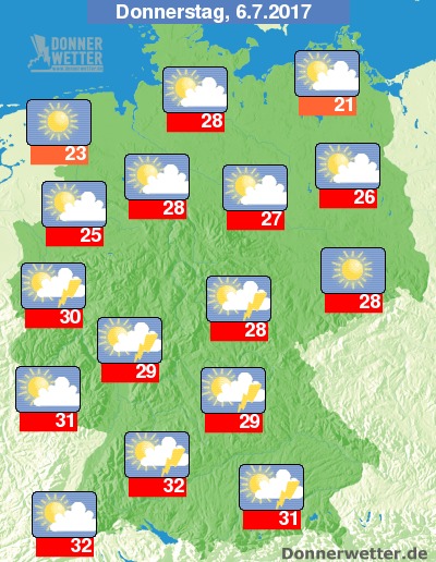 Im Nordosten wechselten sich am Donnerstag (06.07.) Sonne und Wolken bei angenehmen 22 bis 27 Grad C ab. Sonst brannte zunächst die Sonne vom Himmel und heizte die Luft bis zum Nachmittag auf 28 bis 35 Grad C. Im Tagesverlauf zogen von BeNeLux kompakte Wolken mit teils kräftigen Gewittergüssen sowie örtlichen Sturmböen in den Westen und am Abend auch in die Mitte unseres Landes. Auch über der Schwäbischen Alb bildeten sich am Nachmittag einzelne Wärmegewitter.