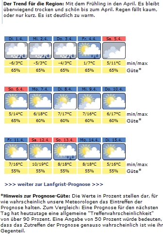 Die Vorhersagen bis zu 30 Tage im Voraus werden auf Basis der Wetterlage mit Hilfe von Computermodellen erstellt. Die Wahrscheinlichkeit ist natürlich deutlich geringer als die Prognosewahrscheinlichkeit der Vorhersagen für die nächsten Tage. Sie können deshalb nur einen Hinweis auf den zur Zeit wahrscheinlichsten Wetterverlauf geben.