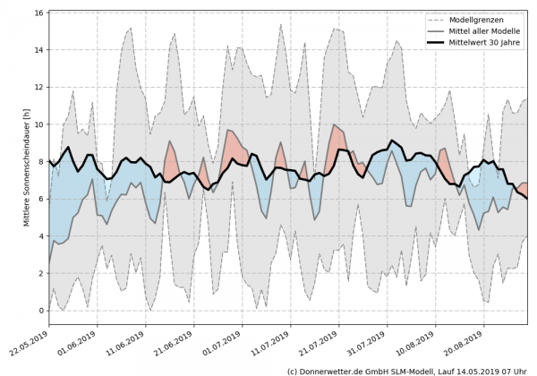 Die kommenden Wochen verlaufen im Osten laut aktueller Berechnungen zu kühl und insgesamt zu trocken. Die Anzahl der zu erwartenden Sonnenstunden liegt unter dem langjährigen Mittel.
