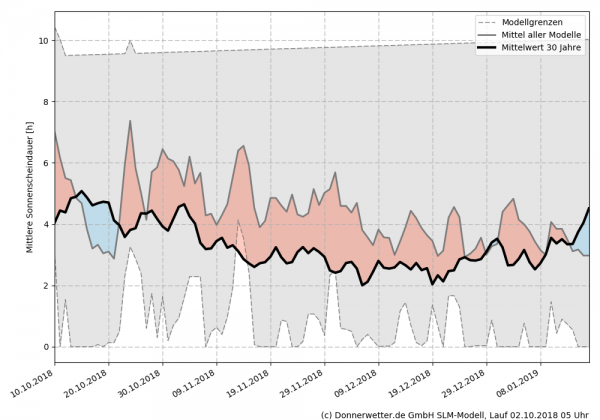Die kommenden Wochen berechnen die aktuellen Langfristmodelle für den Süden als leicht zu kühl und vor allem bis zu Beginn der dritten Novemberdekade als zu trocken. Die Anzahl der zu erwartenden Sonnenstunden bewegt sich über weite Strecken über dem langjährigen Mittel.