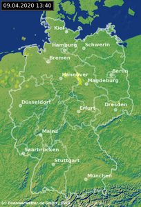 ![]() | | Radarbild 09.04.2020 Keine Niederschlagssignale über Deutschland |