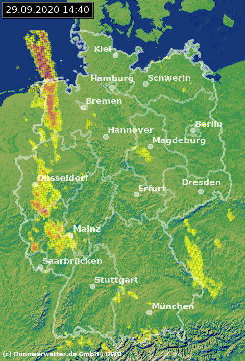 Auf dem Radarbild von 14.40 Uhr erkennt man eine von der Nordsee bis nach Rheinland-Pfalz reichende Zone mit leichten bis mäßigen Regensignalen, teilweise fällt auch Sprühregen. Diese Zone kommt nur wenig ostwärts voran und wird sich allmählich abschwächen. Aus den schwachen Signalen im Süden, sowie am Alpenrand fällt stellenweise etwas Regen oder Sprühregen.