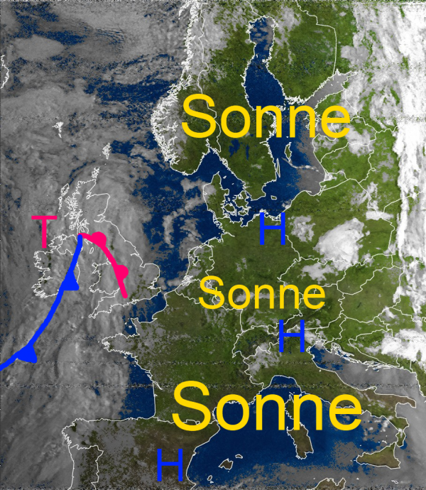 Die Wolken der nächsten Wetterverschlechterung liegen jedoch schon wieder in Lauerstellung. Die Front des Tiefs bei Irland wird uns im Laufe des morgigen Tages in Form von teil kräftiger gewittriger Regengüsse überqueren.
