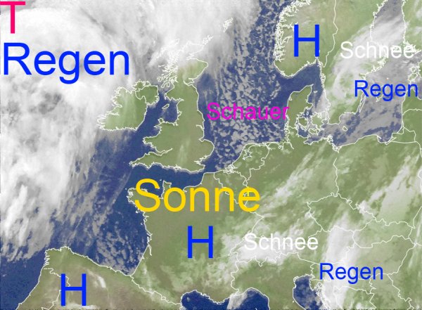 Die Hochdruckzone die von Spanien über Frankreich bis nach Norwegen verläuft sorgt heute in großen Teilen Mitteleuropas für eine kurze Wetterberuhigung, bevor morgen wieder die kompakten Wolken über dem Atlantik mit Regen im Flachland und Schnee in den Bergen nach Deutschland voran kommen werden.