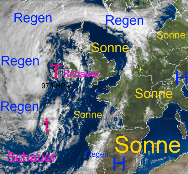 Westlich von Irland hat sich ein mächtiges Sturmtief mit einem Kerndruck von 970 HPa gebildet. Im Vorfeld dieses Tiefs wird nochmals sehr warme und heiße Subtropikluft angesaugt, die sich über weite Teile Deutschlands legt und für schweißtreibende Temperaturen von zum Teil über 35 Grad sorgt. Dazu gibt es über Mittel- und Südeuropa reichlich Sonnenschein.