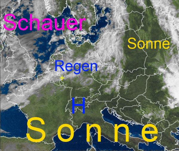 Das von Westfrankreich, über Mitteleuropa, bis zum Baltikum reichende Wolkenband trennt einen freundlichen und spätsommerlichen Süden von einem durchwachsenen und gemäßigten Norden. Im Bereich dieser Wolkenzone fällt gelegentlich Regen. Nördlich davon treten in der kühleren Luftmasse teilweise Schauer auf. In der Nacht schiebt sich von Westen ein neues Regenpaket vom Atlantik in den Nordwesten unseres Landes.