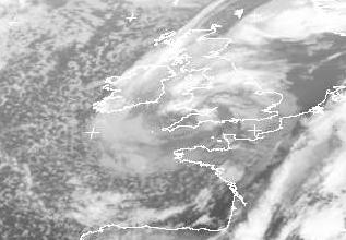 Auf dem Satellitenbild von Montag früh ist das Sturmtief 'Hiltrud' über England gut zu erkennen. Es sorgt heute hier, sowie von Frankreich bis Südnorwegen für teils kräftige Schauer und Gewitter. Gut zu erkennen sind auch die Cumuluswolken, die sich in der kühleren Luftmasse westlich des Tiefs über dem warmen Meer bilden.