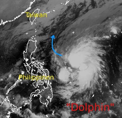 Der Tropensturm 'Dolphin' hat sich mit seinen Wolken heute etwas auf die Philippinen zubewegt. Er erreicht derzeit Windgeschwindigkeiten um 100 km/h im Mittel und bis 130 km/h in Spitzenböen. Unter den Wolken kommt es zu teils ergiebigen Regenfällen. Da 'Dolphin' nun auf eine nördliche Bahn einschwenkt, werden die Philippinen wohl nur am Rande von dem Tropensturm gestreift. (Bildquelle: Copyrigt EUMETSAT, NERC Satellite Receiving Station, University of Dundee)