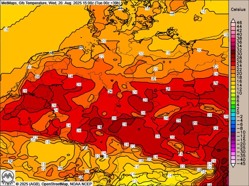 Bevor morgen deutlich kühlere Luft von der Nordsee Deutschland fluten wird, im Süden zieht am Mittwoch zudem Regen herein, können wir uns heute nochmals über einen freundlichen und warmen Sommertag freuen. Im Westen wird mit Temperaturen von 30 bis 32 sogar teilweise ein heißer Tag erreicht..