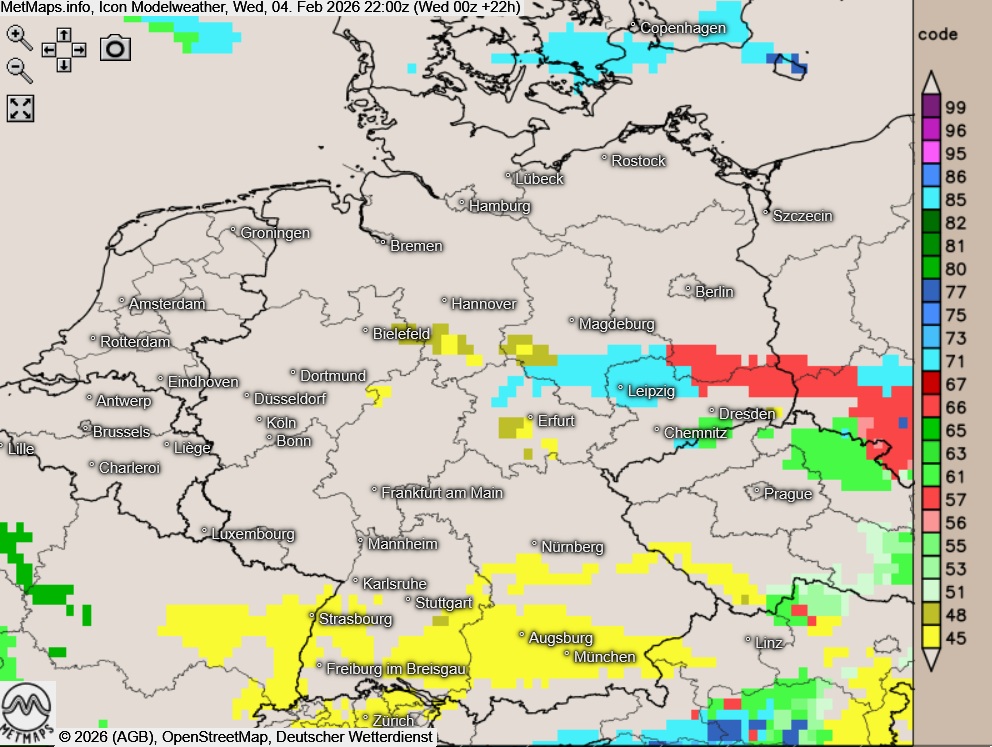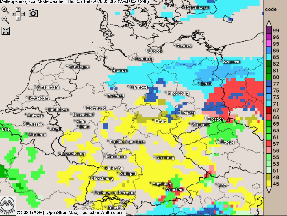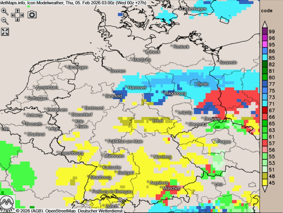 Ein besonders hohes Glätterisiko besteht in den nächsten Stunden vom östlichen Alpenrand über das Sachsen bis in den Berliner Raum. Lokal besteht hier Unwettergefahr.