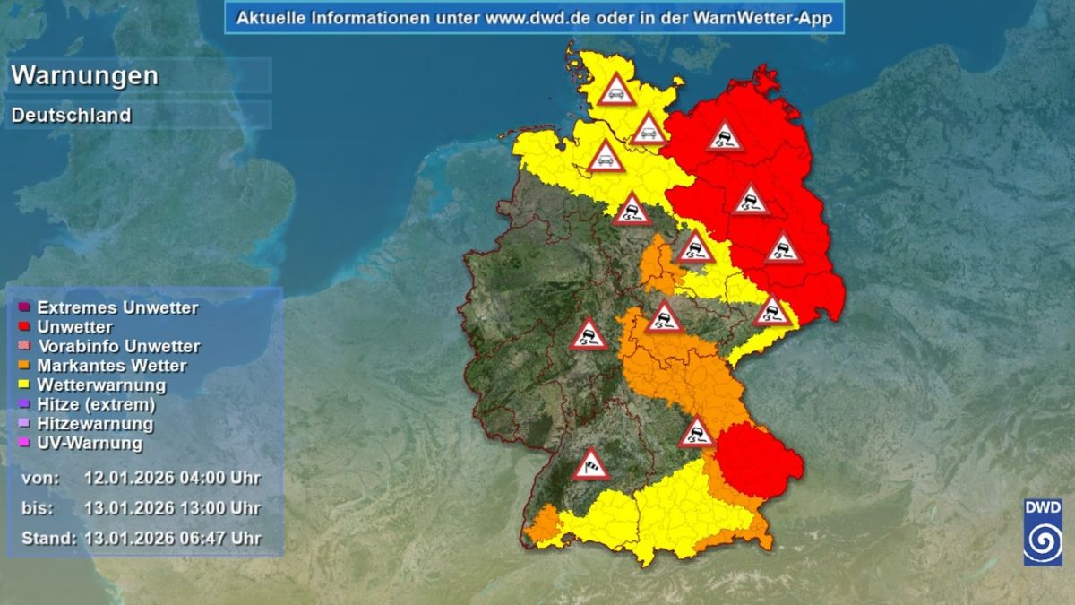 Die Unwetterwarnkarte sowie die Wetterkarte nach ICON-RUC (07:00 Uhr und 11:00 Uhr) mit den Eisregenbereichen in rot: