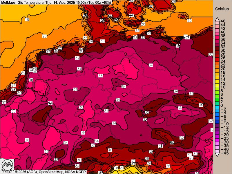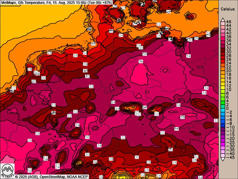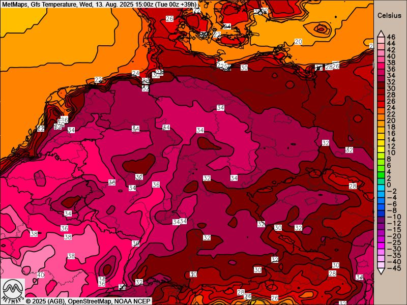 Wie auf den Prognosekarten des GFS-Modells gut zu erkennen ist, fließt nun extrem heiße Luft aus Frankreich zu uns: Bis Samstag steigen die Temperaturen gebietsweise auf 37 bis 39 Grad Celsius – Werte, die teils an historische Augustrekorde heranreichen.