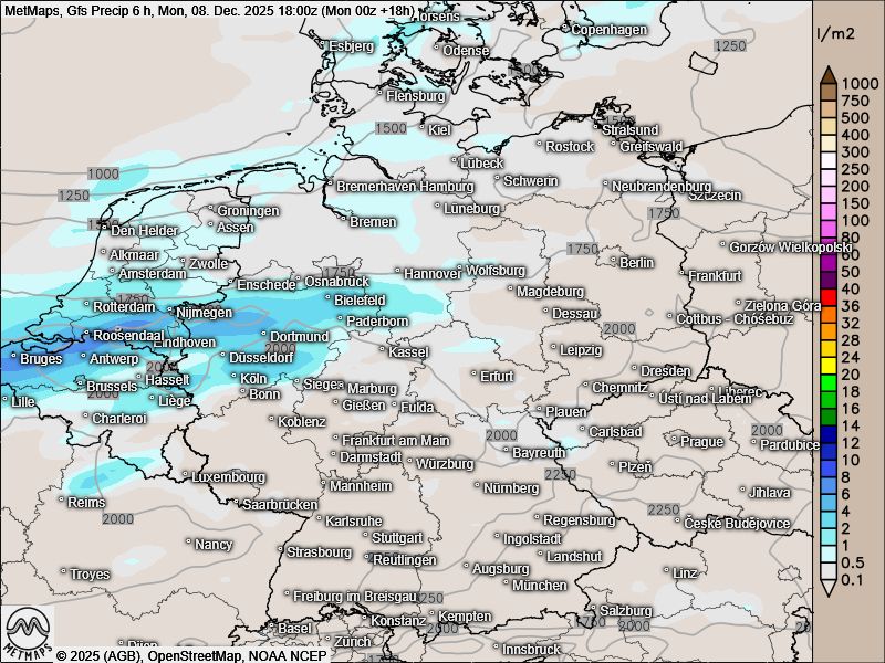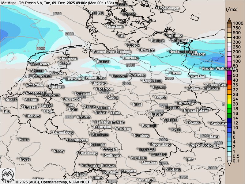 Die Sechs-Stunden-Regenmengen bis Montagabend und Dienstagfrüh, die Wetterkarte für Dienstagnachmittag sowie die Böenkarte für Montagmittag nach GFS: