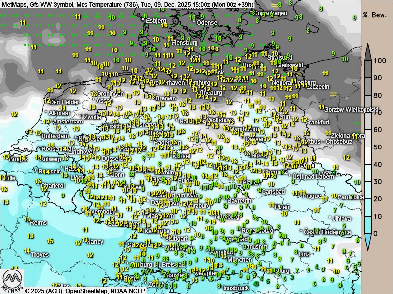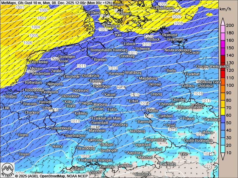 Im Norden und in der Mitte fällt dabei zeit- und gebietsweise etwas Warmfrontregen. An den Küsten muss zudem noch mit Windböen gerechnet werden.