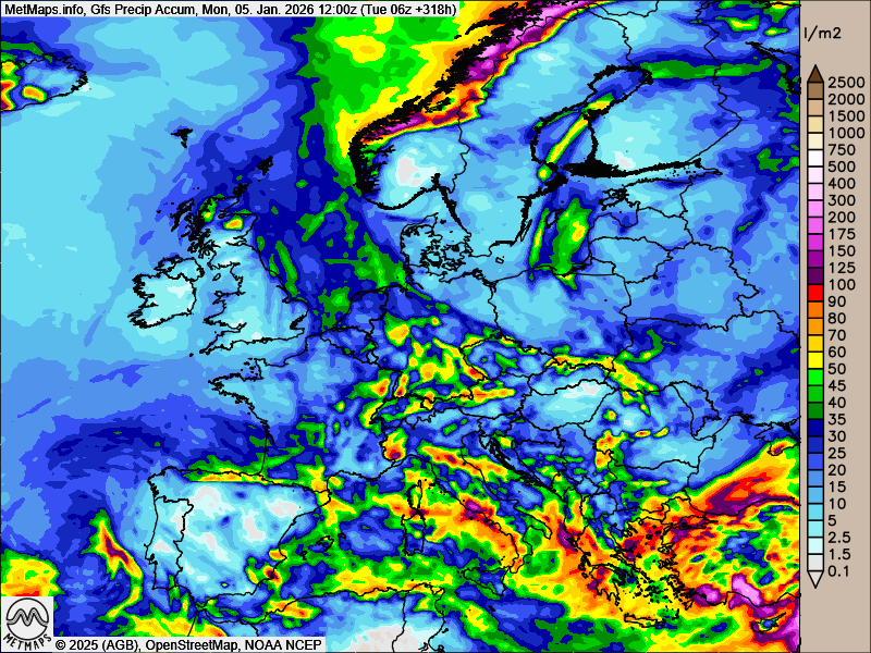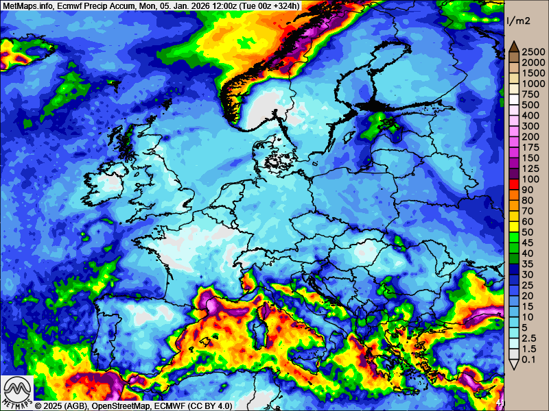 Die akkumulierten Regenmengen für Europa bis zum 05.01.2026 nach ECMWF und GFS: