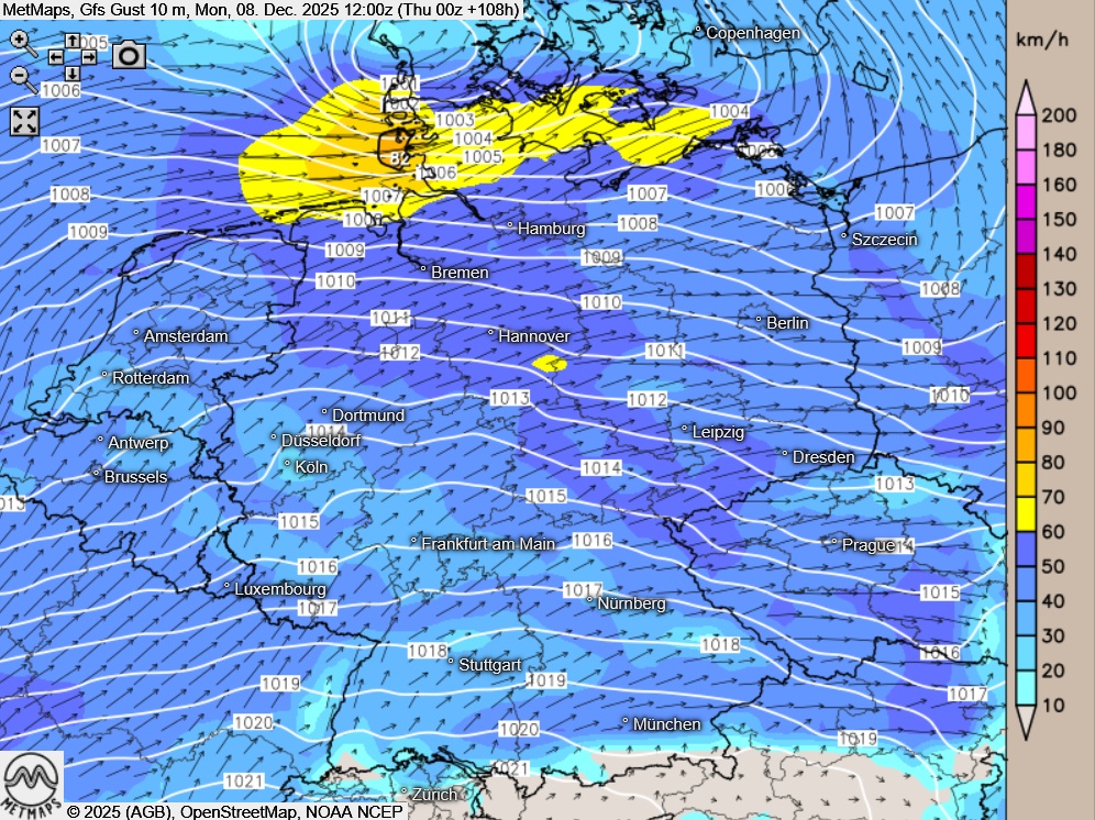 Böenkarte Montagmittag (12:00 Uhr) nach GFS