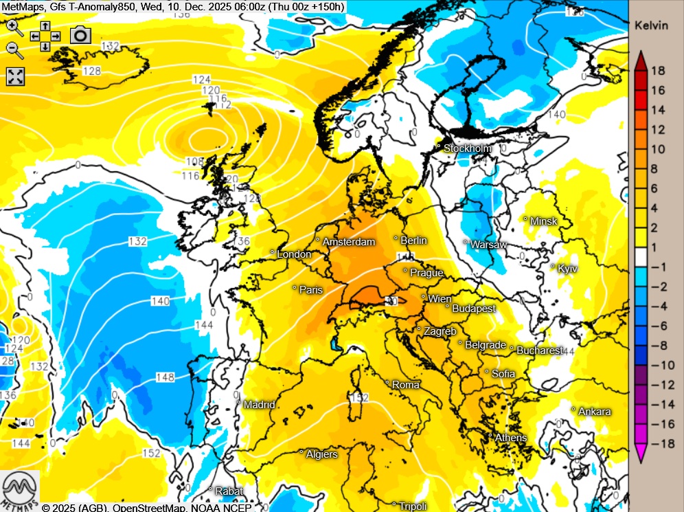 Die Temperaturabweichungen für Mittwochmorgen (06:00 Uhr) für Europa und Deutschland) nach GFS: