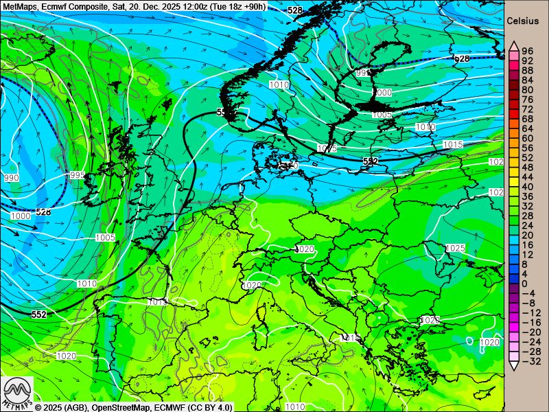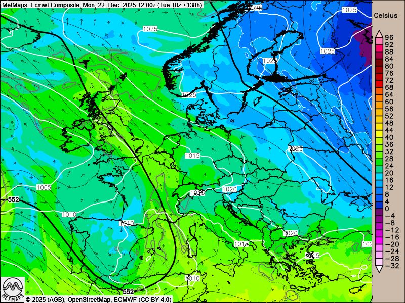 Entscheidend für die Wetterentwicklung über Weihnachten ist das Vorankommen mehrerer Tiefdruckgebiete von Westen in Richtung Mittelmeerraum. Diese Entwicklung, die sowohl vom europäischen ECMWF-Modell als auch vom ICON-Modell gestützt wird, begünstigt den Aufbau einer ausgeprägten Ostströmung über Mitteleuropa sowie über Nord- und Ostsee.