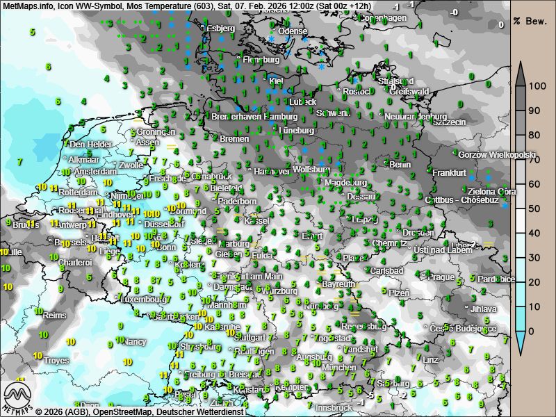 Ganz anders stellt sich die Wetterlage zeitgleich im Norden und Nordosten dar. Entlang der Luftmassengrenze, insbesondere an der Elbe sowie in Schleswig-Holstein, liegen die Temperaturen bei lediglich 0 bis 2 Grad Celsius. Dort kann es vereinzelt zu leichtem Schneefall kommen.