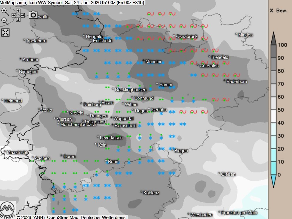 Gefrierender Regen (rote Symbole) am Samstagmorgen