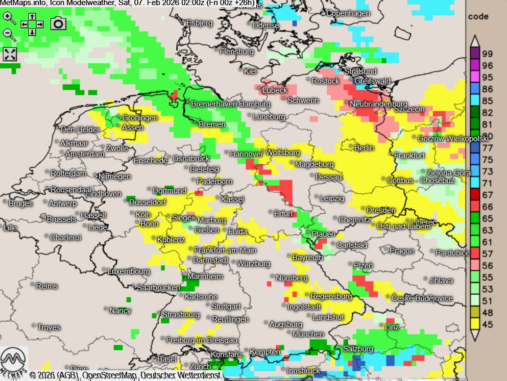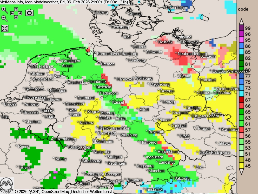 Vom Emsland über Nordhessen bis zum Bayerischen Wald ist mit Glättegefahr durch gefrierenden Regen zu rechnen. Auch östlich dieser Linie besteht gebietsweise Glättegefahr.