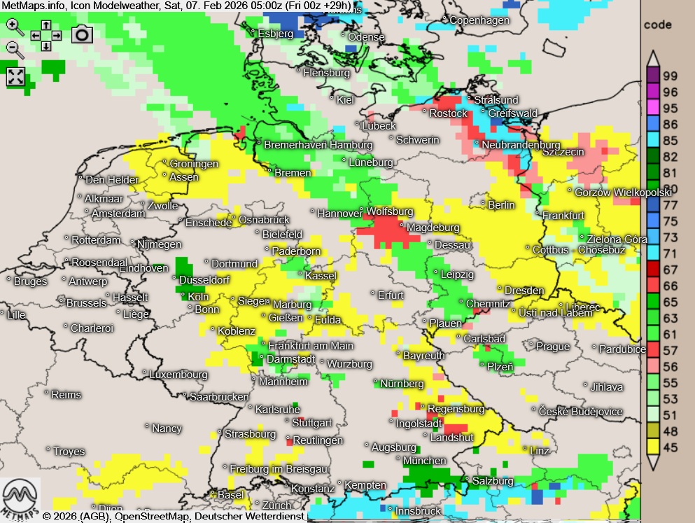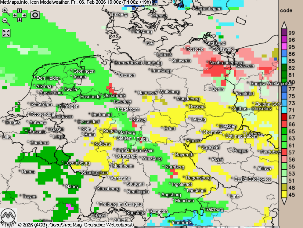 Die Wetterkarten für  mit gefrierendem Regen für 19:00, 21:00, 02:00 und 05:00 Uhr nach ICON: