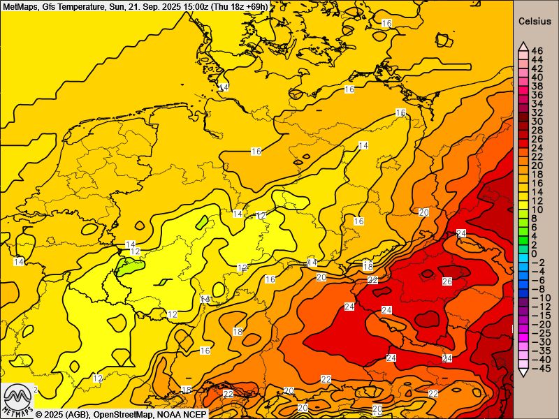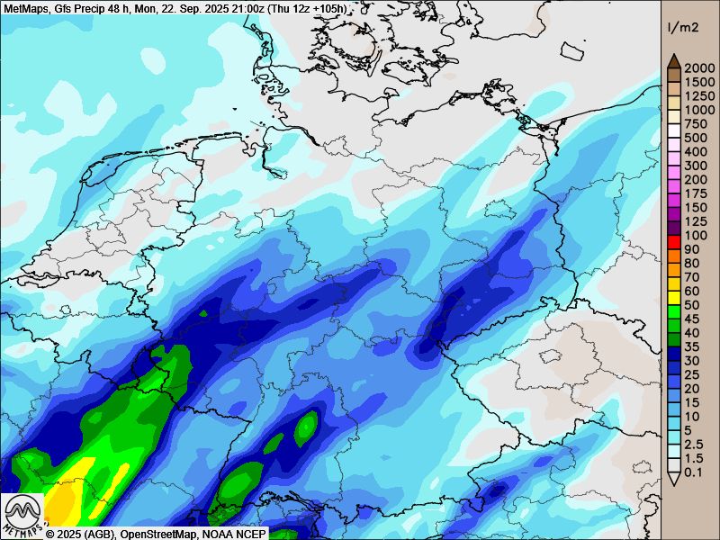 Die Karten bilden die Temperaturen am Samstag- und Sonntagnachmittag nach GFS sowie die 48-Stunden-Regenmengen bis Montagabend ab. Gebietsweise sind 30-40 l/m² Regen innerhalb von 24 Stunden zu erwarten.