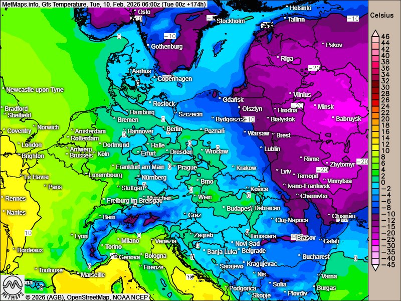 Die Temperaturkarten für heute und nächste Woche Dienstag (10.02.)