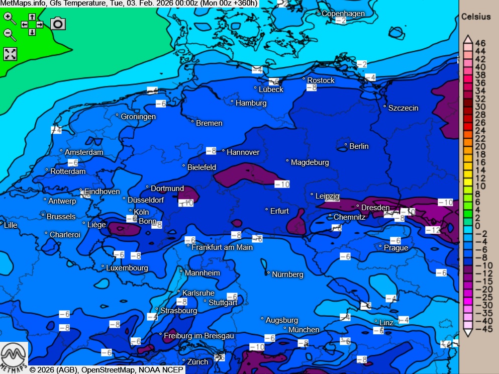 Die Temperaturen nach ECMWF und GFS für den 03.02.2026 (00:00 Uhr) mit lokal zweistelligen Minusgraden.