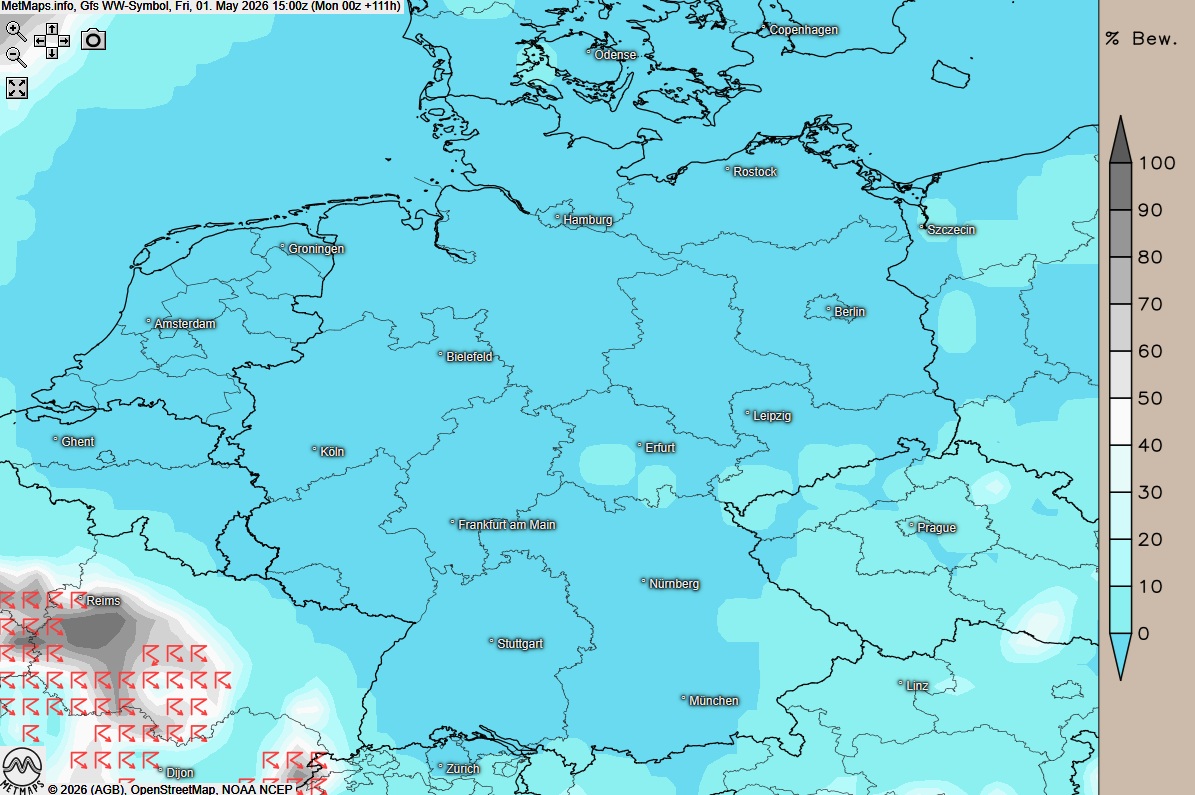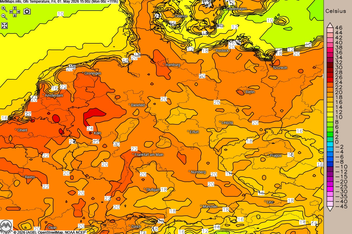 Die Temperatur- und Wetterkarte für den 01.05 (15:00 Uhr) nach GFS: