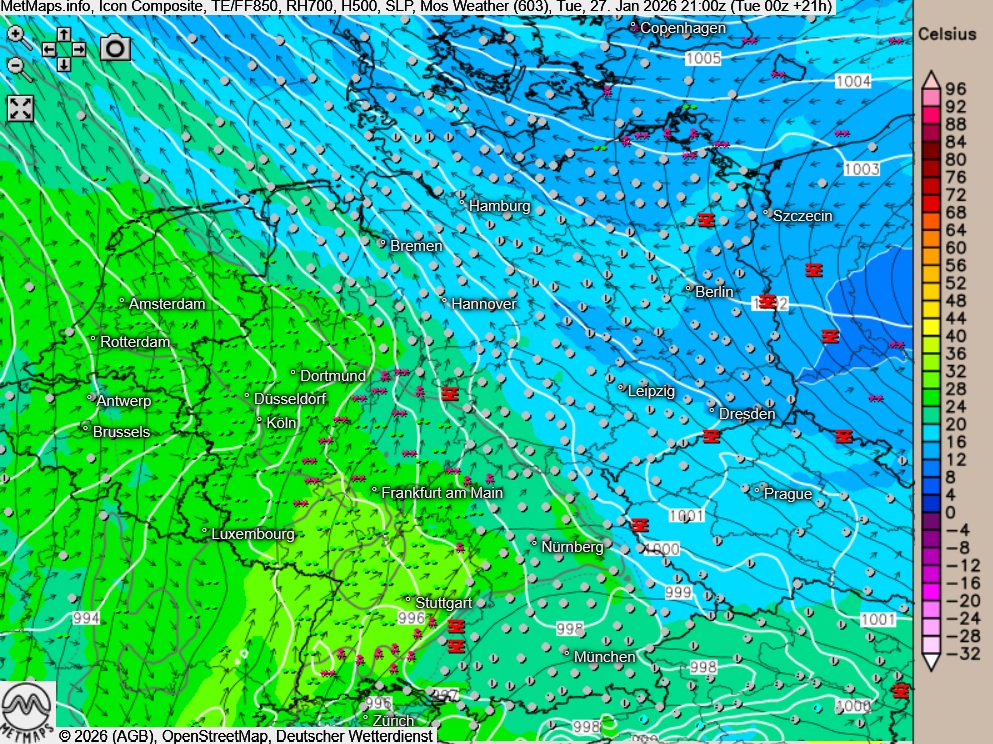 Die Wetterkarte mit Eisregengebieten (rot) sowie die Strömungs- / Wetterkarte nach ICON (21:00 Uhr):