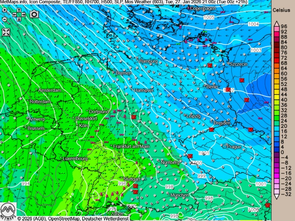 Die Wetterkarte mit Eisregengebieten (rot) sowie die Strömungs- / Wetterkarte nach ICON (21:00 Uhr):