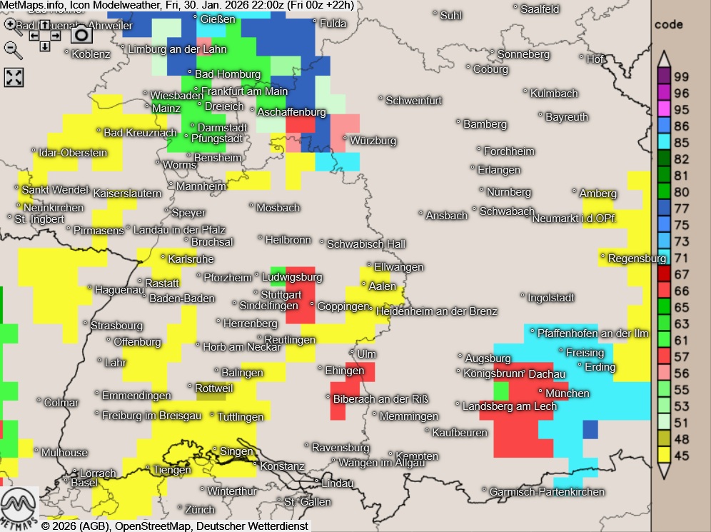 Die Wetterkarte für 22:00 Uhr und 06:00 Uhr mit gefrierendem Regen nach ICON: