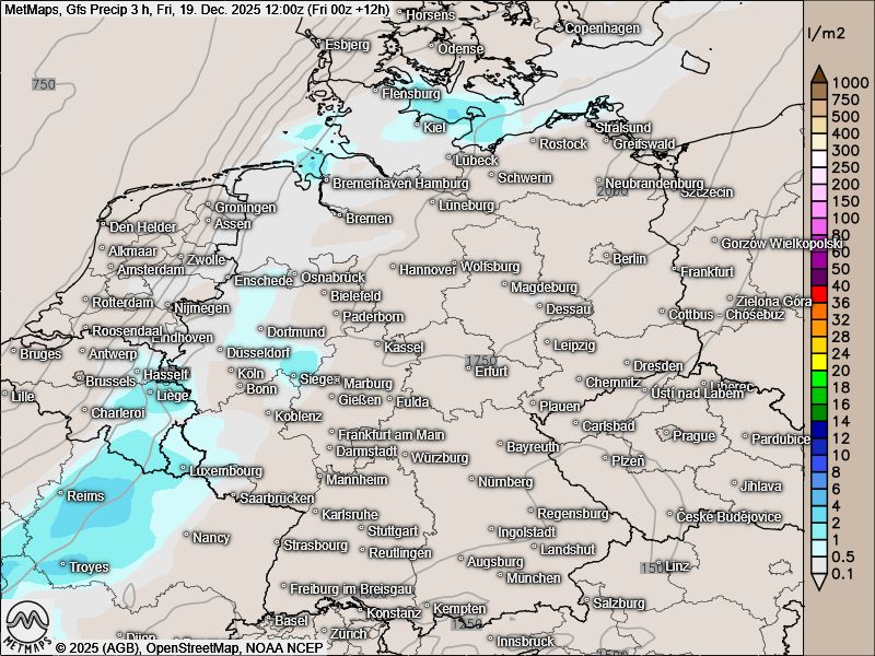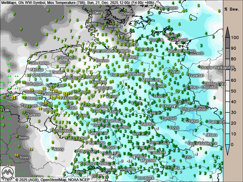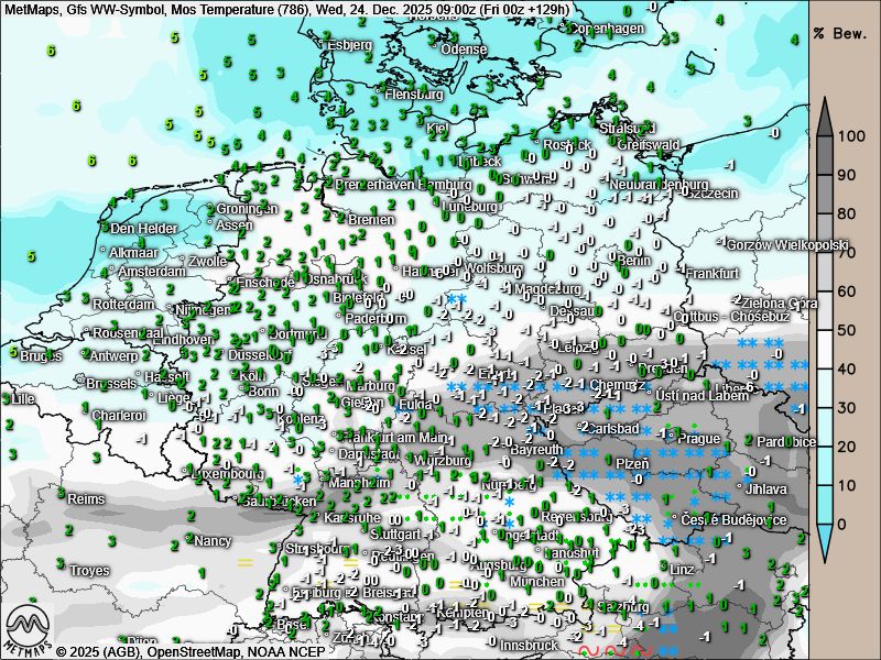 Die Drei-Stunden-Regenmengen bis Freitagmittag (12:00 Uhr), die Wetter- / Temperaturkarte für den 4. Advent sowie die Wetter- / Temperaturkarte für Heiligabend (09:00 Uhr) nach GFS: