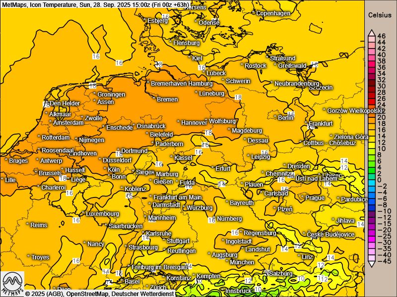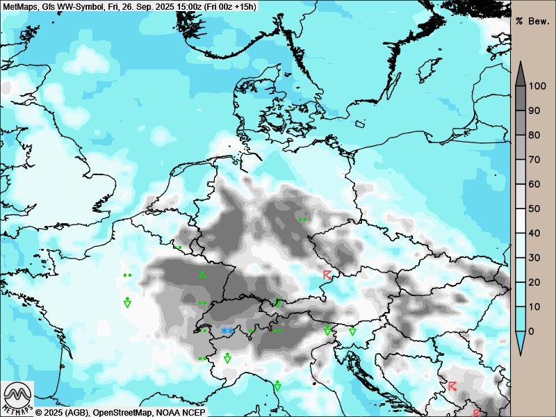 Die Wetter- und Niederschlagskarte für Freitag (GFS), die Lufttemperaturen am Sonntagnachmittag (Icon) sowie die 72-Stunden-Regenmengen bis Anfang Oktober: