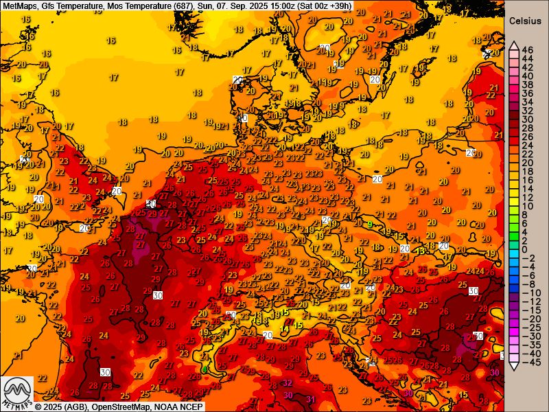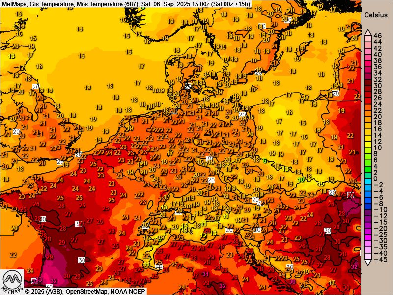 Ein tolles Spätsommerwochenende mit viel Sonnenschein steht uns bevor - auch wenn es nicht ganz so warm wird wie zunächst prognostiziert: Die wärmsten Stellen finden wir am Sonntag vermutlich in NRW und im Rheintal bei Spitzenwerten von 25 bis 28 Grad. Die 30 Grad bleiben unseren Nachbarn in Belgien und Frankreich vorenthalten. Bereits schon am Montag bringt eine Front Abkühlung.