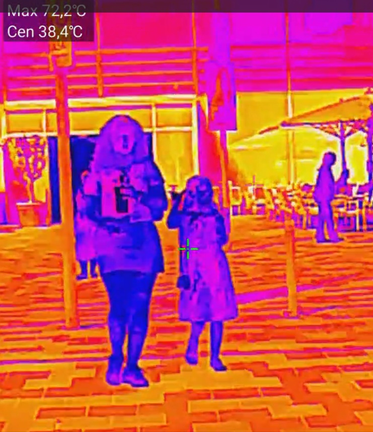Die gefilmten Personen erscheinen dagegen in kühleren Farbtönen, die Körper erscheinen hier fast als Kälteinseln. Deutlich erkennbar ist auch ein Getränk in der Hand, das als dunkelster Bereich im Bild den niedrigsten Temperaturwert aufweist.