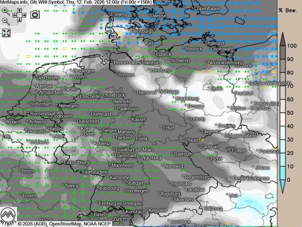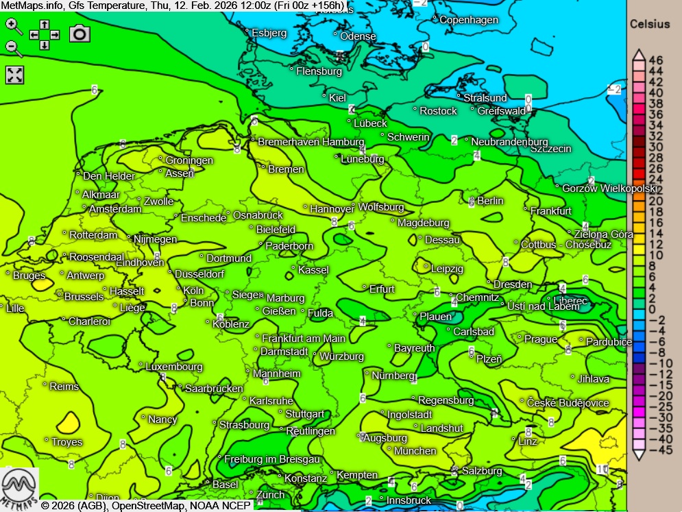 Die Wetter und Temperaturkarte für Weiberfastnacht nach GFS: