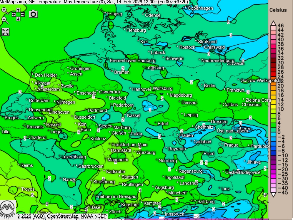 Bei den Temperaturen geht GFS für Karnevalssamstag (14.02.) zumindest von einer Angleichung des aktuell großen Südwest- / Nordost-Temperaturgefälles aus - hier die prognostizierten Lufttemperaturwerte für 12:00 Uhr sowie die Wetterkarte für Karnevalssonntag mit Schnee in Teilen Norddeutschlands.