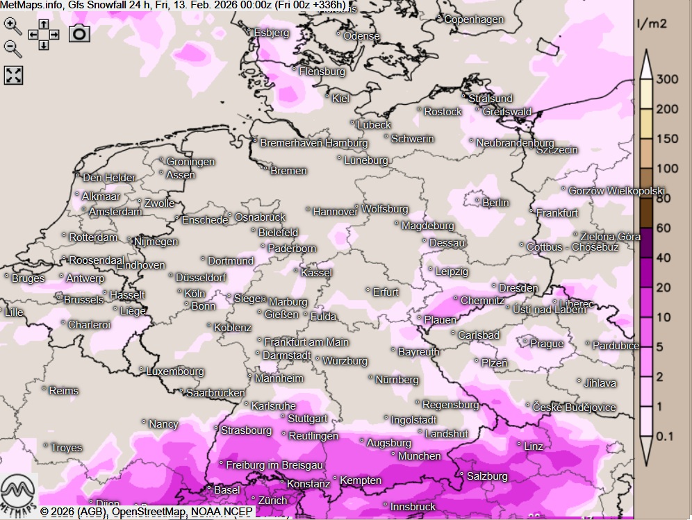 Hier die 24-Stunden-Schneemengen nach ECMWF und GFS für Weiberfastnacht (12.02.):